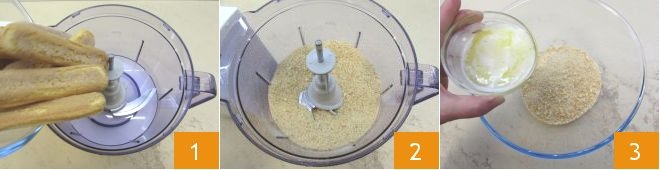 To prepare the Tiramisu cheesecake, start with the base. Prepare the coffee (espresso or moka): you will need a total of 170 g (let it cool afterward), then melt the butter in a saucepan, being careful not to burn it, then let it cool. In the meantime, place the ladyfingers in a mixer 1 and blend until they turn into a powder 2. Transfer them to a bowl and add the cooled melted butter 3.