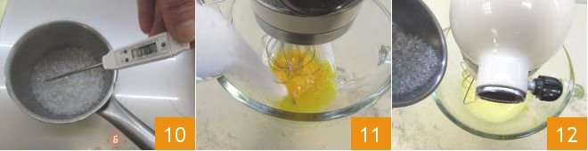 Check the temperature with a food thermometer 10; when it reaches 239°F, add the yolks and the rest of the sugar to the stand mixer and start whipping 11. When the syrup reaches 248°F, remove it from the heat and start pouring it into the stand mixer 12, little by little, in 3 batches, turning off the beaters each time to scoop the syrup from the sides of the bowl.