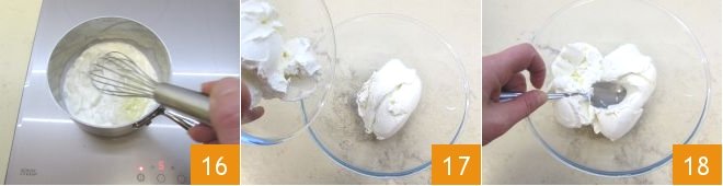 Continue whipping until the mixture is completely cool 13. Then, in a saucepan, heat the cream (no need to boil it) 14 and add the gelatin that you had soaked, after squeezing it well 15.