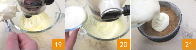 Add the cheeses, one tablespoon at a time, to the stand mixer while it's running 19. Finally, also add the cream in which you dissolved the now-cooled gelatin 20. Let the beaters mix just long enough to combine all the ingredients of the cream, then turn them off. Retrieve the firmed base from the fridge and pour a first layer of cream over it 21.