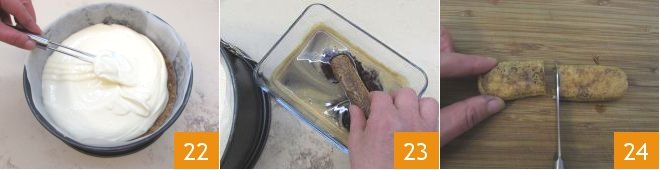 Level the surface with a spatula 22. Quickly dip the ladyfingers in the remaining 120 g of coffee 23 and cut them in half 24.
