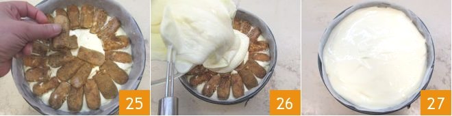 Arrange the half-ladyfingers in concentric circles within the cake pan 25, then cover with the second and last layer of cream 26 and level it too. Place your Tiramisu cheesecake in the fridge to set for at least 3-4 hours 27.