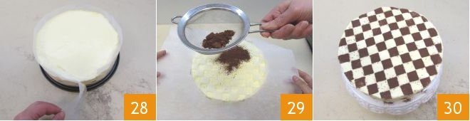 After the setting time, gently remove the ring of the pan and the paper on the edges 28. At this point, you can simply dust the surface of the cake with sifted cocoa powder, or, to create a checkerboard like ours, proceed as follows: draw a circle the same diameter as the pan on a sheet of parchment paper; use a ruler to draw horizontal and vertical lines to form squares, and finally, using a knife or cutter, cut out half of the squares alternately to create a checkerboard. Have someone help hold the parchment paper over the cake and dust with cocoa powder 29. Then remove the parchment paper: your Tiramisu cheesecake is ready to be enjoyed 30!