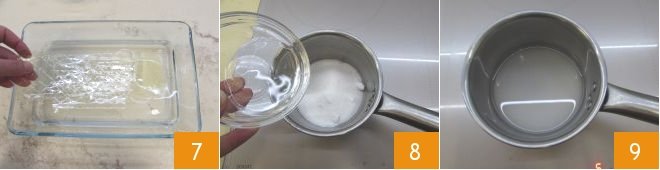 In the meantime, focus on the cream. First, soak the gelatin in cold water 7. In the meantime, put 65 g of sugar and 45 g of water in a heavy-bottomed saucepan 8. Bring the syrup to a boil 9.