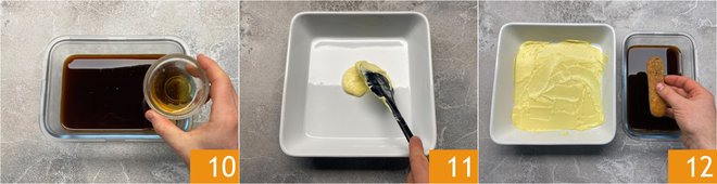 Finally, flavor the now cold coffee with the rum 10. You are ready to assemble the dessert: take a 9.5 x 9.5-inch baking dish and cover the base with a spoonful of cream 11, covering the entire surface. Quickly dip the ladyfingers in the coffee 12 and create a first layer; a few seconds per side will suffice, otherwise they will absorb too much liquid and release it during fridge rest.