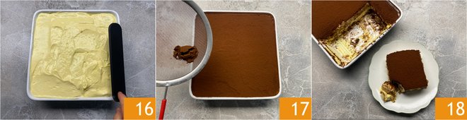 Level the surface 16 and place in the fridge to set for at least one hour. After the resting time, dust with unsweetened cocoa to taste 17 and serve your tiramisù with whipped cream 18!