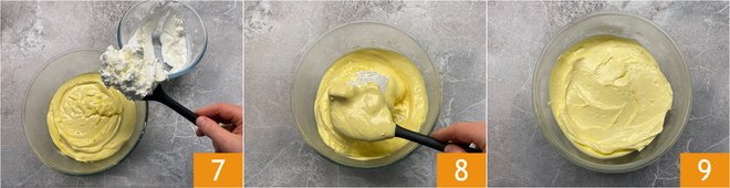 At this point, gently fold the whipped cream into the mascarpone mixture 7, mixing delicately from bottom to top 8 to avoid deflating it 9.