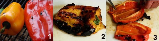 First, grill the peppers directly over the coals 1 until the skin is burned 2; they should have a soft yet still crunchy texture. Place in a container, cover with plastic wrap, and let them sweat. This process will make it easier to remove the pepper's skin. Then peel them and remove the seeds and internal filaments 3.