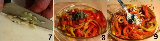 and then chop 7. In a container, put the sliced peppers, chopped capers, and garlic (8-9), and pour in three of the five tablespoons of extra virgin olive oil, salt, and pepper to taste. Let it rest.