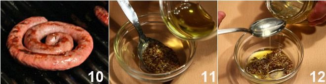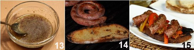 Grill the bread slice 14, lay the pepper salad on top, place the luganega, and spoon over some sweet and sour mustard sauce 15.