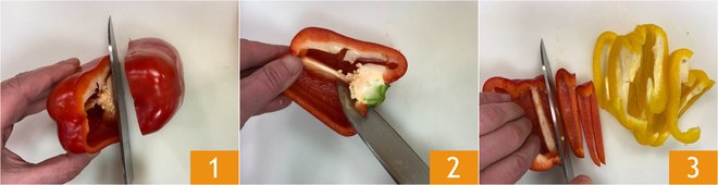 To prepare tofu with peppers, first, make the Vegetable broth following our recipe. Wash the peppers, cut them 1, and remove the seeds and internal filaments 2. Then cut them into strips 3.