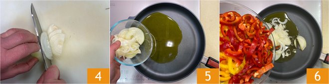 Also, slice the onion into thin slices 4. In a non-stick pan, pour the oil, add the onion 5 and the peppers 6.
