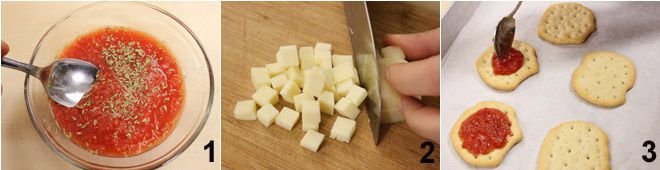 To prepare the tomato and mozzarella flatbreads, start by preheating the oven to 392°F, then place the tomato sauce in a bowl, add the oregano, salt, and two tablespoons of olive oil, mix well 1 and set aside. Cut the mozzarella (or provolone) into small cubes 2, take the baking sheet and line it with parchment paper, lay the flatbreads on top, pour a tablespoon of sauce on each appetizer 3 and top with a few pieces of mozzarella. Bake for about 5 minutes, just enough time to melt the mozzarella. Once cooked, remove the flatbreads, garnish with basil leaves, and serve them hot.