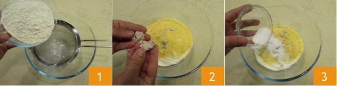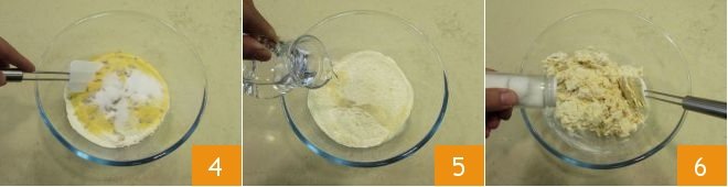 Mix the ingredients 4 and start pouring the water in a thin stream 5 while continuing to mix with the spatula; add salt 6.