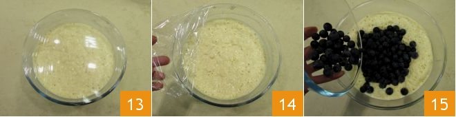 After the rising time of the dough has elapsed, take it back 13, remove the plastic wrap 14 then add the Concord grape berries inside 15