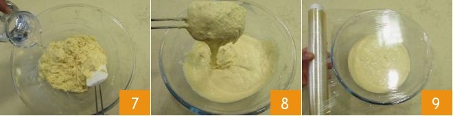 Continue kneading in the bowl and gradually pouring the water until you obtain a very hydrated, semi-liquid mixture 8. Cover with plastic wrap 9 and let it rise for about 1 hour at a temperature of 80-82°F (even an off oven with the light on will do).