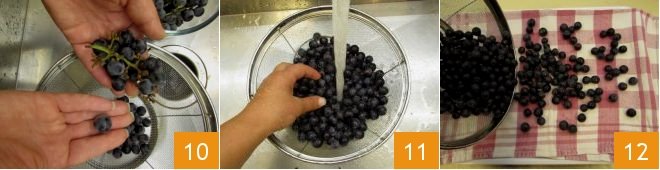 In the meantime, take the Concord grapes and detach the berries from the stems 10; then rinse them gently under running water 11, then drain them on a clean towel 12 and dry them by gently dabbing so as not to break the berries.