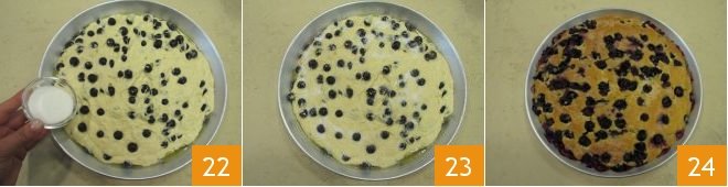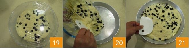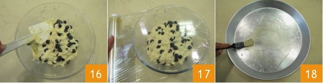 and gently mix with the spatula 16 so that the berries mix with the dough but without breaking. Cover with plastic wrap again 17 and let rise in the off oven with the light on for about 45 minutes. Grease a 12.5-inch diameter pan 18 and turn on the static oven to 356°F to preheat it before baking the cake.