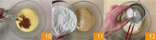 Also, pour in the seed oil 10 and blend everything with the beaters 11. At this point, add the sifted flour 11 and baking powder 12.