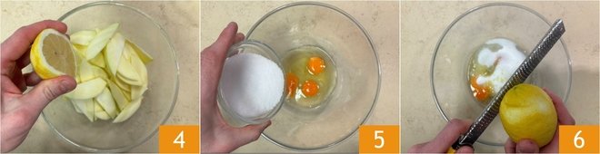 Place the apples into 2 separate bowls and drizzle with lemon juice to prevent them from browning 4. Break the eggs into another bowl, then add the sugar 5 and grated lemon zest 6.