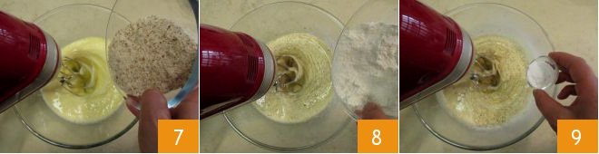 the crumbled almonds mixed with the sugar 7, the flour 8, the baking powder 9,