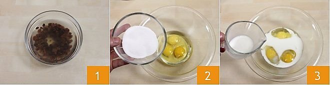 Soak the raisins in rum and enough lukewarm water 1 to cover them completely. Crack the eggs and place them in a bowl with the sugar 2 and milk 3