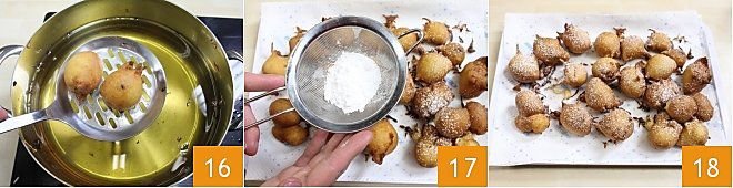 The frying should be done slowly so that the tortello has time to cook inside without burning on the outside. Fry all the dough in small batches until it's all used; when the tortelli are golden brown, drain them with a slotted spoon 16 and place them on paper towels to absorb the excess oil. Dust the tortelli with raisin scented with orange with powdered sugar and cinnamon (17-18) and serve them hot or warm.