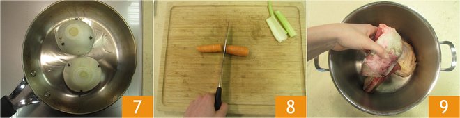 Add the celery and carrots 10. When the onions are well browned, remove them with a fork 11 and transfer them to the pot 12.