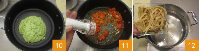 Pour the zucchini pesto into another pan and set aside for the moment 10. When the cherry tomatoes are cooked, turn off the heat, season with salt, and set aside 11. At this point, the water for the pasta should be boiling, so salt it and cook the tagliatelle for 2 minutes less than the time indicated on the package 12.