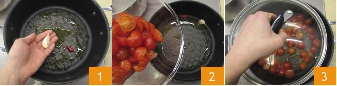 To prepare the tricolor pasta, first heat a drizzle of oil in a pan and sauté the garlic clove with the whole chili pepper for a few minutes 1, then add the cherry tomatoes cut in half 2, close with the lid 3 and cook on low heat for about 10 minutes.