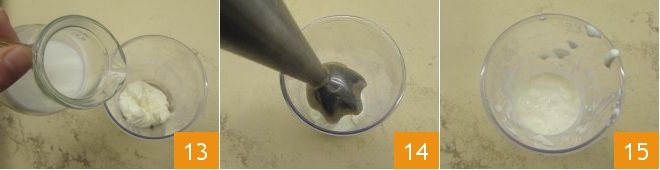 Meanwhile, prepare the crescenza cream: place the cheese in a tall, narrow container, add the milk 13, and blend with an immersion blender 14 until you obtain a fluid but still consistent cream 15. Season with salt and set aside.