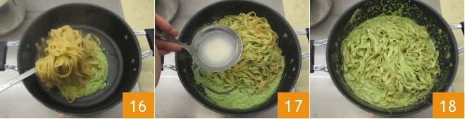 After the tagliatelle cooking time, drain them directly into the pan with the zucchini pesto 16, add at least a ladle of pasta cooking water 17 and mix well to combine everything over medium-low heat 18.