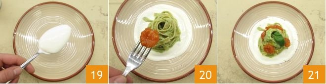 Now you are ready to plate: spread a spoonful of crescenza cream on the bottom of the serving plate 19, place a nest of tagliatelle in the center and add a few cherry tomatoes 20. Finally, season with a grind of black pepper, a drizzle of oil, and garnish with a fresh basil leaf... your tricolor pasta is ready to be served 21!