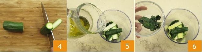 Meanwhile, bring a pot of water to a boil for the pasta and prepare the zucchini pesto: wash the zucchinis and remove the ends, then cut them in half crosswise and remove only the green part that you will use to make the pesto 4. Transfer the zucchini skin to a tall, narrow container, add the oil 5, the basil leaves 6,