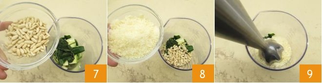 the pine nuts 7, and the grated Parmesan cheese 8. Blend with an immersion blender 9 until you obtain a smooth and homogeneous cream and season with salt.