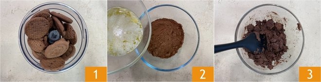 To prepare the triple chocolate cheesecake, start with the base: put the cocoa cookies in a food processor 1 and pulse them until finely ground, then transfer them to a bowl and add the melted butter 2, mixing well until you get a uniform mixture 3.