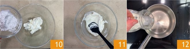 Place the Philadelphia cream cheese in a bowl, add the powdered sugar 10 and stir to combine 11. Heat 1/3 cup (80 ml) of heavy cream in a small saucepan 12.