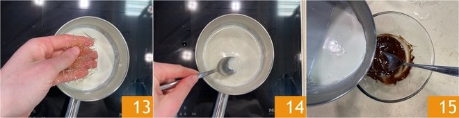Add the well-drained gelatin 13 and stir until it has dissolved 14. Pour the hot cream over the dark chocolate 15.