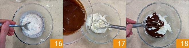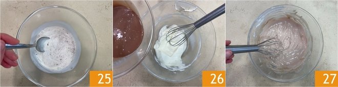 Stir well with a spoon 25 until you obtain a homogeneous mixture, then pour it into the bowl with the cream cheese and sugar 26 and mix until you have a smooth, even milk chocolate cream.