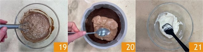You should obtain a smooth cream 19; this will be the first layer. Take the base from the refrigerator and pour the dark chocolate cream over the now-set cookie crust. Level it well with a spoon, then return it to the refrigerator. Let it firm up for 30 minutes. In the meantime, proceed in the same way to make the milk chocolate layer: soak the gelatin in cold water and in a bowl mix together the cream cheese and powdered sugar 21.