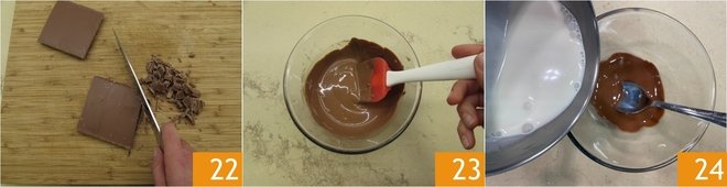 Now chop the milk chocolate 22, transfer it to a bowl and melt it in the microwave 23. Dissolve the gelatin in the hot cream and pour it into the melted chocolate 24.