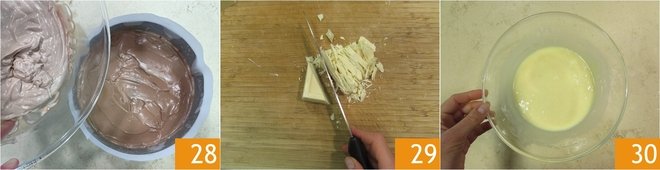 Take the pan from the refrigerator and pour the milk chocolate cream over the dark chocolate layer 28. Level well and return to the refrigerator to set for about 30 minutes. Meanwhile, prepare the final layer, the white chocolate: chop it finely 29, transfer it to a bowl and melt it in a bain-marie or in the microwave 30.