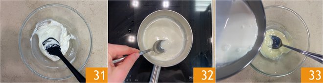 Soak the gelatin and mix together the cream cheese and powdered sugar 31. Dissolve the gelatin in the hot cream 32 and pour the mixture into the melted white chocolate 33.