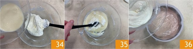 Mix well, then pour into the bowl with the cream cheese and powdered sugar 34. Stir until you obtain a homogeneous mixture 35, then take the pan from the refrigerator and pour the white chocolate cream over the milk chocolate layer to form the third layer 36.