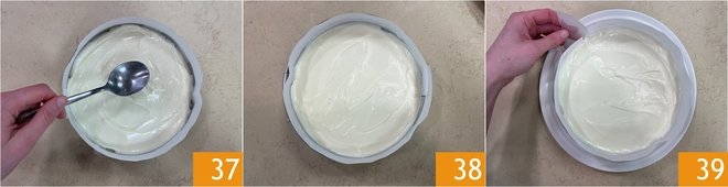 Level the surface 37 and let it set in the refrigerator for at least 4 hours. After the resting time, the cheesecake will be well set 38, so carefully remove the parchment paper from the sides 39.