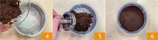 Pour the cookie mixture into an 8-inch springform pan already buttered and fully lined with parchment paper 4, then press down firmly with a meat mallet 5 or the back of a spoon to create a solid base 6. Chill in the refrigerator for 30 minutes (or in the freezer for 10 minutes).
