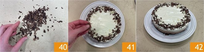 Use a vegetable peeler to shave curls from the three chocolates 40 and arrange them on the surface to create a decorative ring 41. Your triple chocolate cheesecake is ready to enjoy 42!
