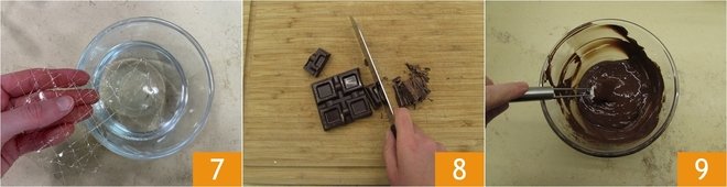 Now make the first layer, the dark chocolate one. Soak the gelatin in cold water for 5–10 minutes 7. Meanwhile, chop the dark chocolate 8 and melt it in a bain-marie or in the microwave 9.