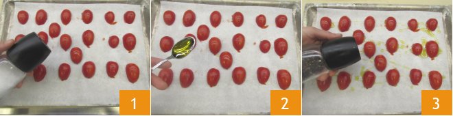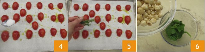 To prepare the troccoli with baby spinach pesto and cherry tomatoes, first take care of the roasted cherry tomatoes: wash and dry the cherry tomatoes, then cut them in half and place them cut side down on a baking tray lined with parchment paper. Season them with salt 1, olive oil 2, pepper 3