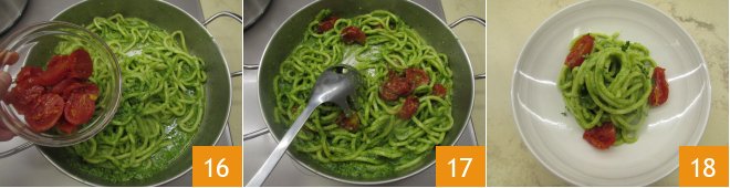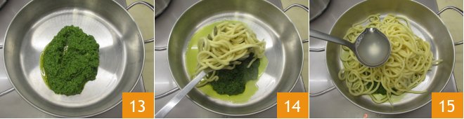 Pour the pesto into a pan 13, then drain the pasta here 14. Add a ladle of cooking water to the pesto in the pan 15 and mix everything well with the heat off.